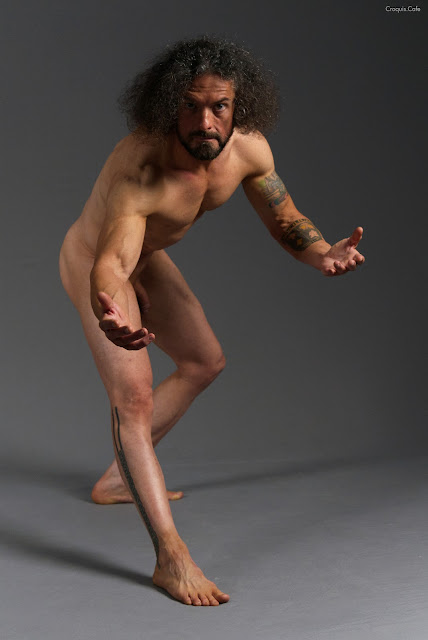 Starting with charcoal, use a collection of sweeping inverse radial arcs to describe the action /gesture of the figure. Visualize these arcs as defining the "envelope" of the figure, ie. within the overlapping arcs is the area that the figure occupies, and outside of these arcs is the "flux" or everything that's background or negative space.